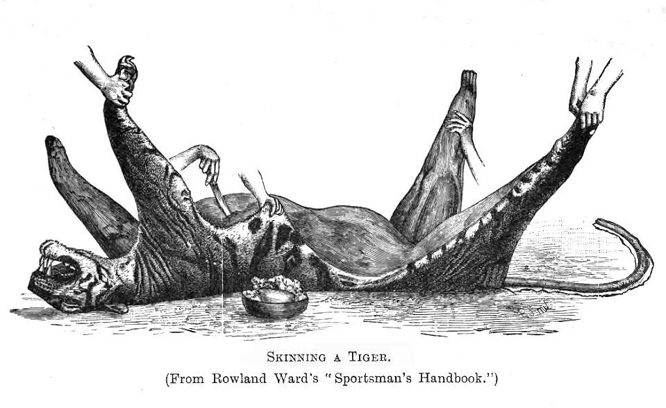I am told that when, on one occasion, a European shot a tiger, the Natives were so keen on securing some of the fat, that the shikāris (hunters) came to him to decide as to the proper distribution among themselves and the camp servants. [sic]