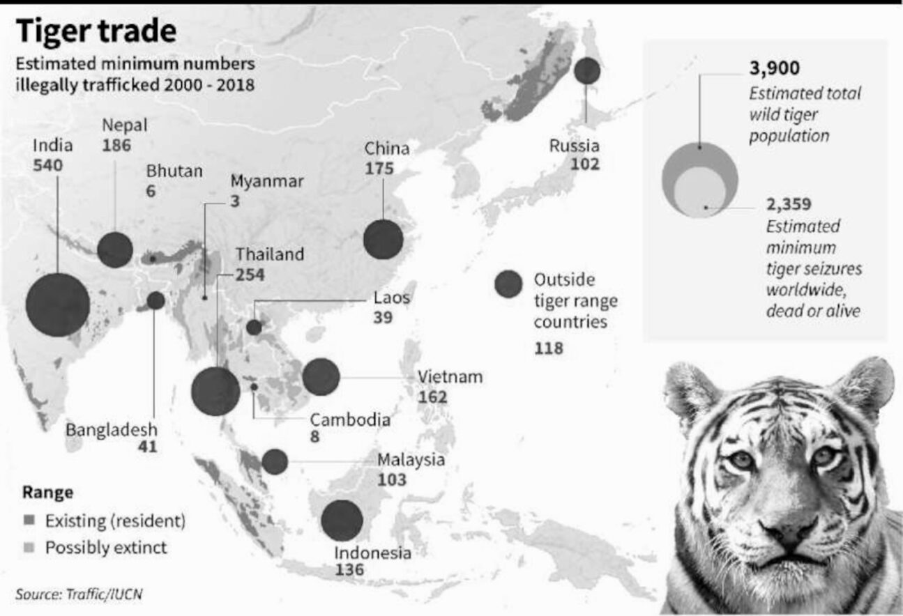 Major consumers (importers) of Tiger bone are South Korea, Taiwan, Japan, China,